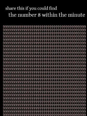 5. Nah, kalau Anda bisa mendapatkan angka 8 di bawah 15 detik berarti mata kamu masih jeli dan cerdas. Kalau antara 30 hingga 40 detik, artinya standar. Tapi kalau lebih dari 1 menit, wah harus periksa ke dokter mata, deh.